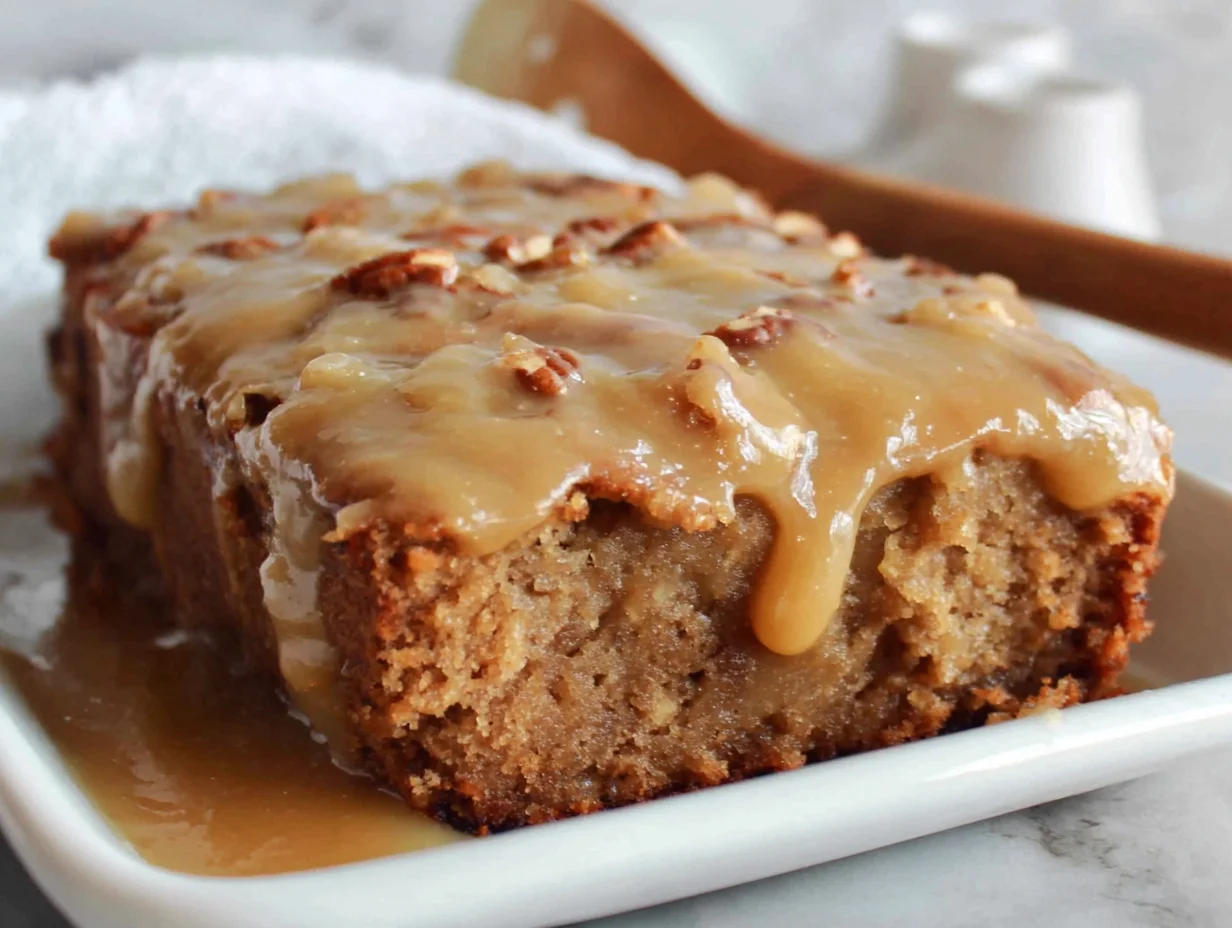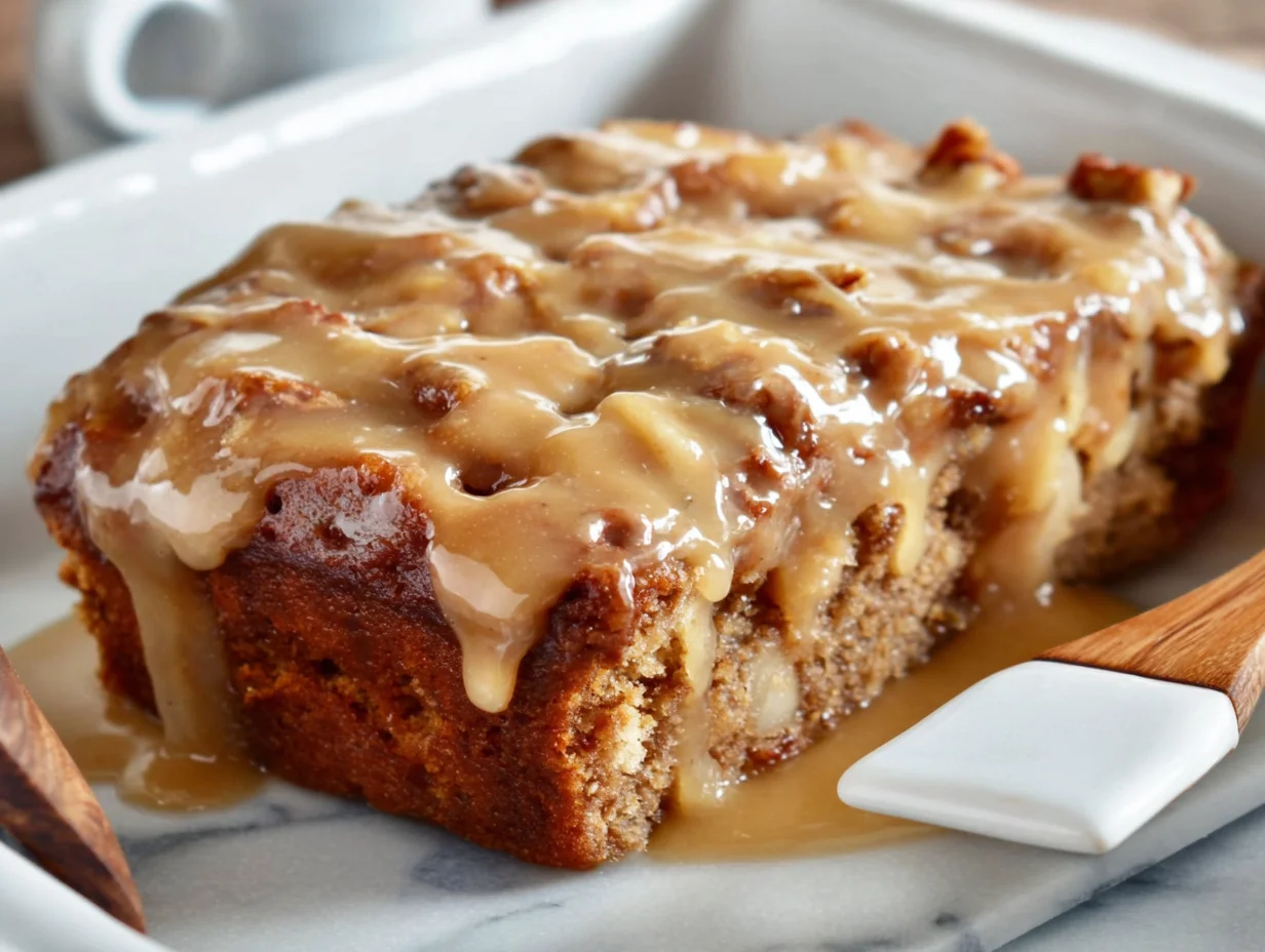Now it’s time for the real magic: that warm, buttery brown sugar glaze that transforms this cake from “really good” to absolutely unforgettable. It’s poured over the cake while it’s still hot, so it seeps into every little crevice and edge, keeping the cake moist and adding that deep, caramel-like flavor you just can’t replicate with frosting or icing.