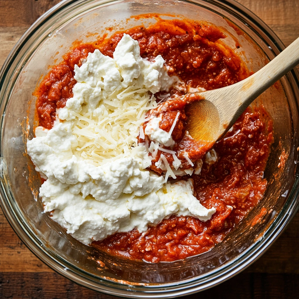 In a large mixing bowl, combine half of your shredded mozzarella, all the ricotta cheese, and your marinara sauce. Stir it all together until it’s creamy and evenly blended. This is where the magic begins—the mixture coats every noodle with cheesy, saucy goodness.