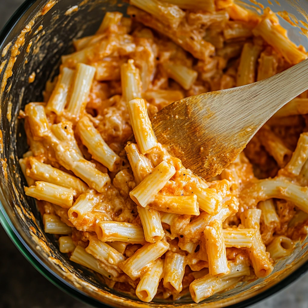 Now, pour the cooked ziti into the bowl of cheese and sauce. Stir everything together until every piece of pasta is coated in that velvety, cheesy mixture. At this point, it’s already hard not to grab a spoon and dig in—but trust me, the oven transformation is worth the wait.