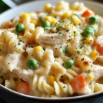 Chicken Pot Pie Pasta is a comforting and creamy dish that combines the best of two beloved comfort foods: the classic chicken pot pie and hearty pasta. With tender chicken, a rich sauce made from chicken broth and cream, and a medley of vegetables, this pasta dish offers all the savory flavors of a chicken pot pie but skips the pie crust for a quicker, more accessible meal. It’s a one-pot wonder perfect for busy weeknights or family dinners, and it’s highly customizable to suit dietary preferences or available ingredients.