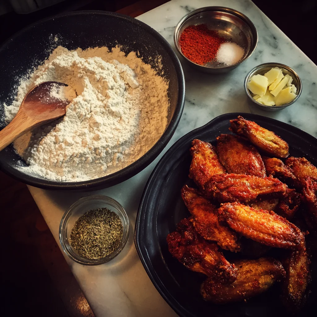 This recipe is my go-to when I want that classic Buffalo-style flavor with a little homemade flair. The wings are seasoned, dredged in a light flour coating, and fried to golden perfection. Then, they’re tossed in a buttery hot sauce that’s just the right mix of fiery, tangy, and a little sweet (if you want it). You can even tweak the heat level depending on who you’re feeding — more cayenne for spice lovers, or a touch of honey to mellow things out.