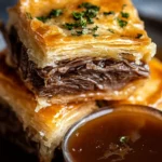 Now, there’s a fun, convenient twist on this classic: French Dip Squares. This variation transforms the sandwich into a shareable, bite-sized dish that’s perfect for parties, game days, or family dinners. Instead of assembling individual sandwiches, French Dip Squares use crescent rolls as a base and top layer, sandwiching thin slices of deli roast beef and Swiss cheese in between. The entire dish is baked until golden and served alongside a warm beef broth for dipping, keeping the spirit of the French dip alive while offering a new format that’s easier to prepare and share.