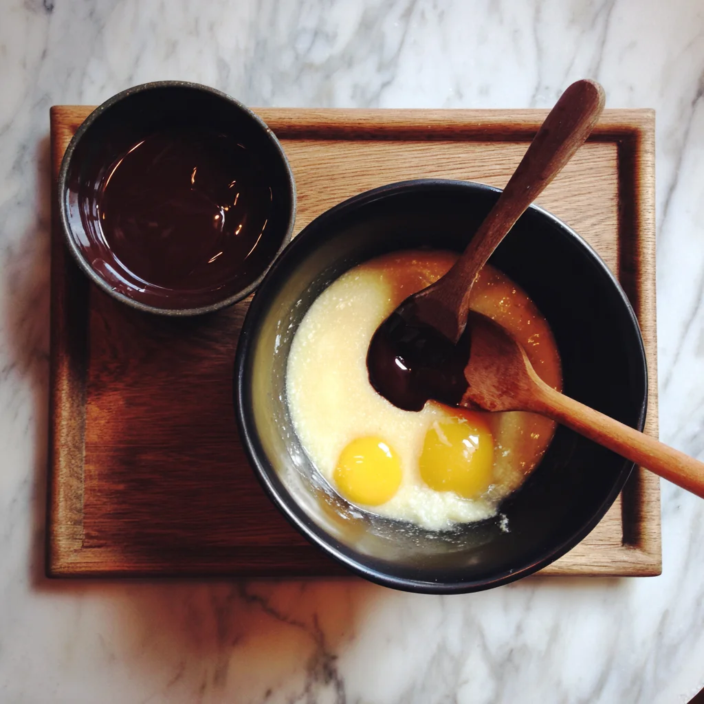 Slowly mix the melted chocolate mixture into the egg mixture until fully incorporated.
