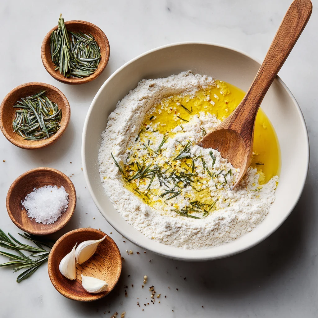 Stir in the flour and salt, followed by olive oil, rosemary, and garlic. Mix until a sticky dough forms. Cover the bowl with a clean towel or plastic wrap and let rise in a warm place for 1 hour, or until doubled in size.