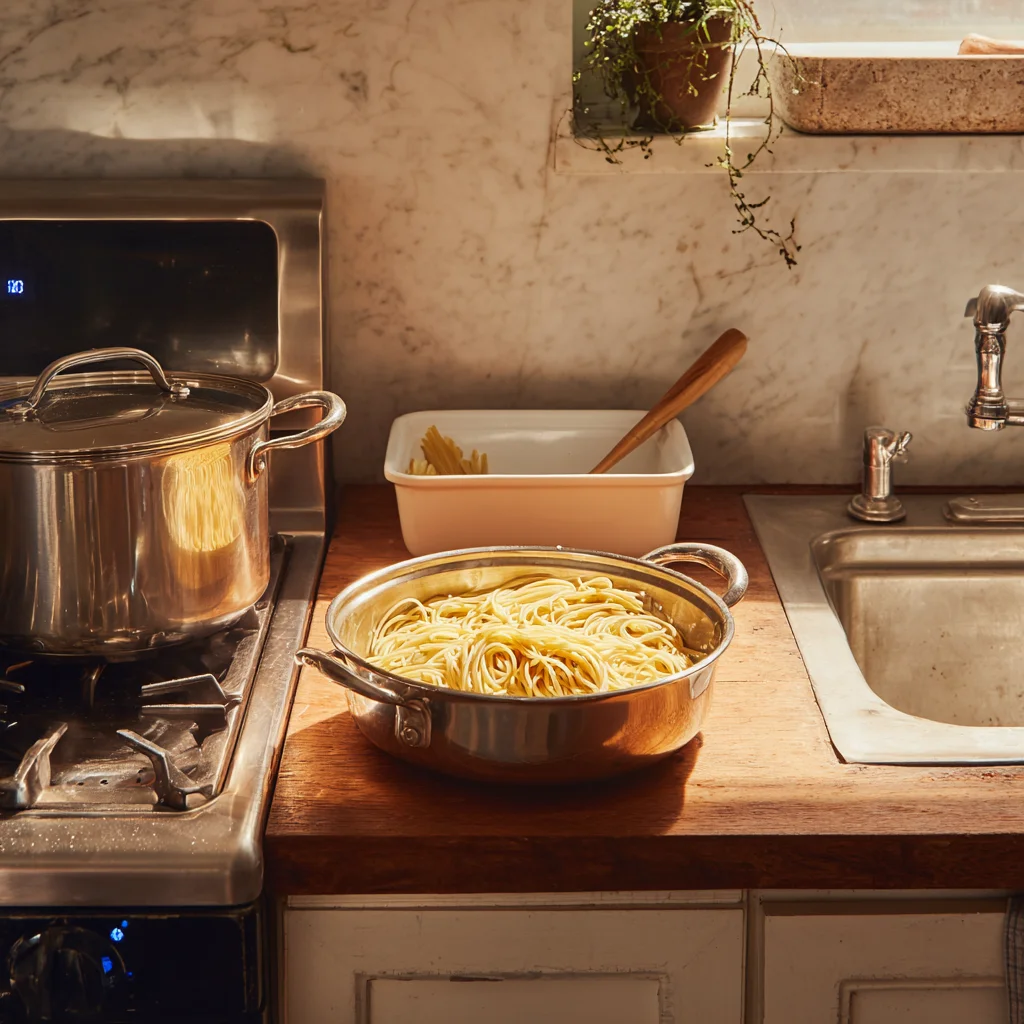 With your creamy, spicy sauce ready and your spaghetti cooked and drained, it’s time to bring it all together.