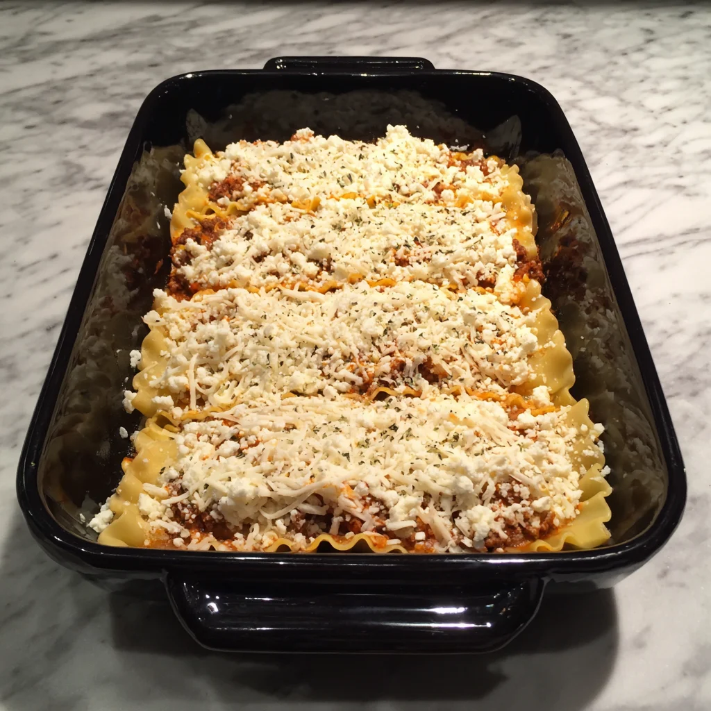 Finally, lay down your last 3 lasagna noodles and finish strong with the remaining shredded cheese sprinkled generously over the top. Don’t be shy—this is what gives you that melty, bubbly, golden crown of deliciousness.