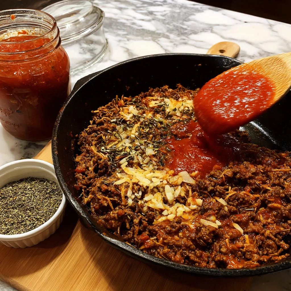 Now comes the cheeseburger magic: stir in the minced garlic, salt, black pepper, ketchup, and yellow mustard. Let everything cook together for another 2 minutes so the flavors can really blend. Remove the pan from heat and fold in the diced dill pickles. The pickles might seem like an odd addition in a lasagna, but they’re what gives it that tangy, unmistakable cheeseburger flavor.