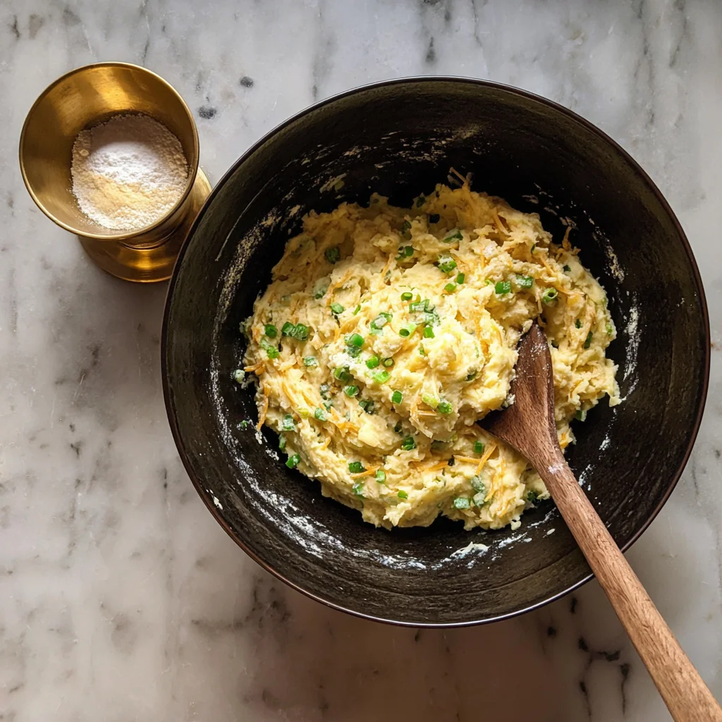 In a large bowl, mix together the mashed potatoes, egg, shredded cheese, flour, green onions, salt, and pepper until well combined. The mixture should be thick and hold its shape. If it’s too loose, add a little more flour.