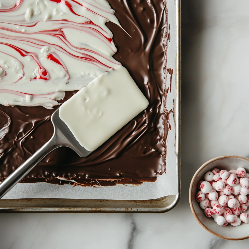 - Top with white chocolate: Melt the white chocolate chips, stir in the peppermint extract, and spread this mixture evenly over the hardened dark chocolate.