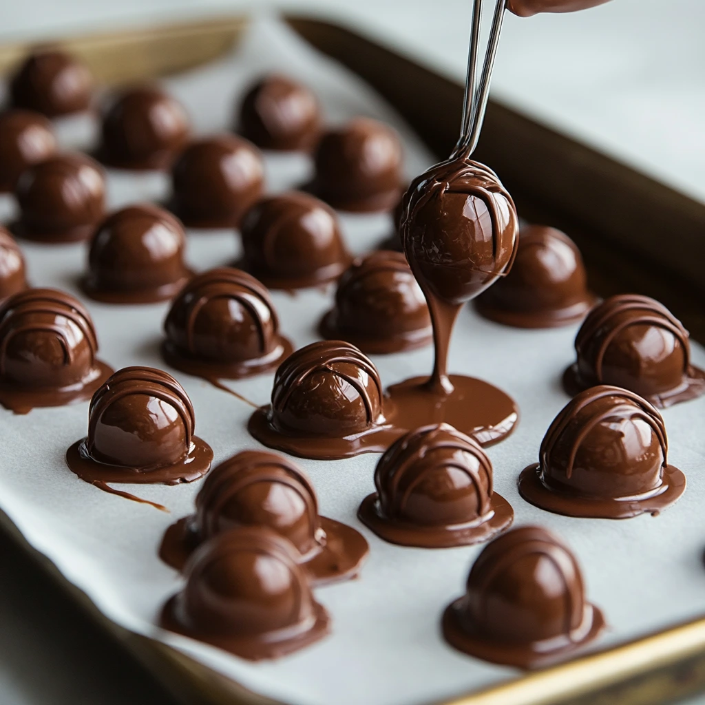 Here comes the satisfying part! Take your chilled peanut butter balls and, using a fork or dipping tool, immerse each ball into the melted chocolate. Roll it around to ensure it’s fully coated, then carefully lift it out, letting the excess chocolate drip off. Place each dipped ball back onto the parchment-lined baking sheet.