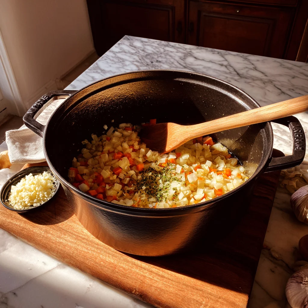 1️⃣ Heat olive oil in a large pot or deep skillet over medium heat. Add the chopped onion, carrots, and celery. Sauté for 6-8 minutes until the vegetables are soft and slightly golden. Stir in the minced garlic and cook for another minute.