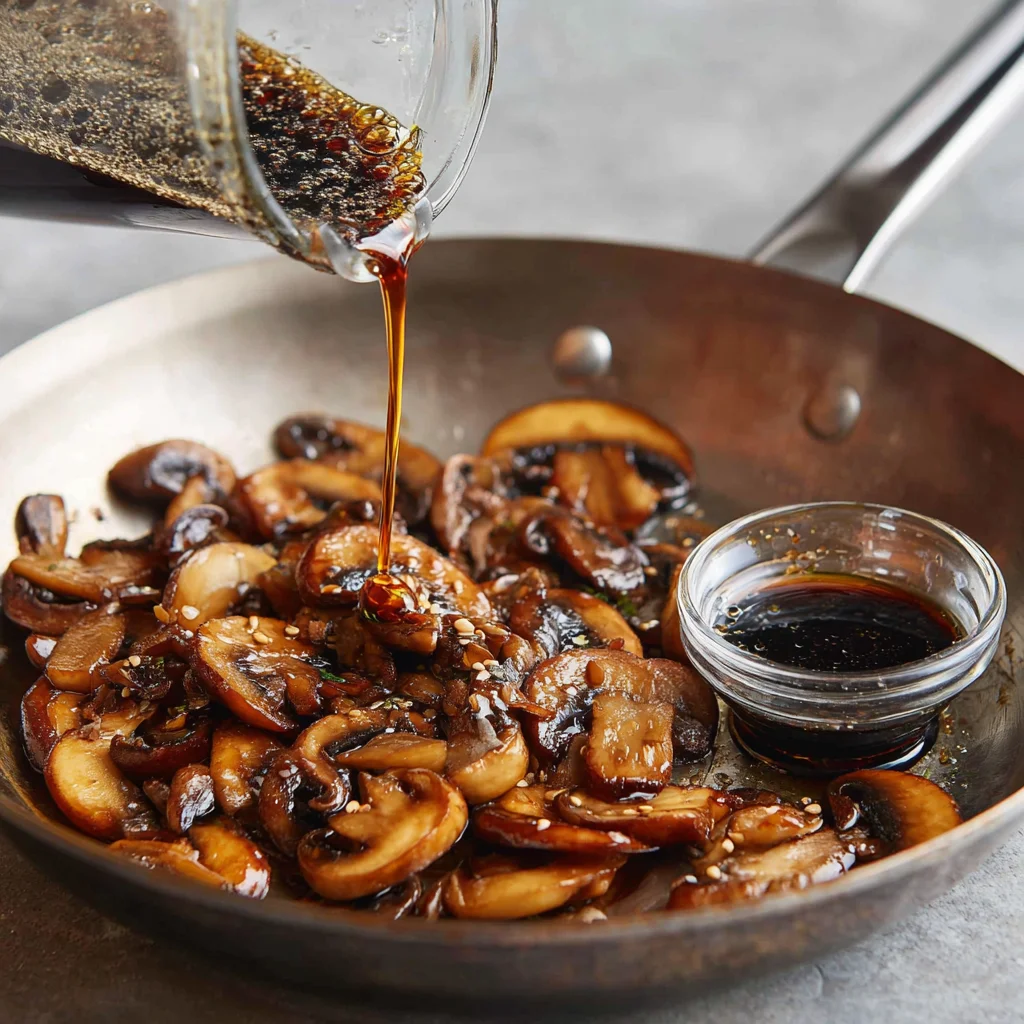 Pour in 1 tablespoon of soy sauce and 1 teaspoon of balsamic vinegar (if using). Give everything a stir to evenly distribute the seasoning. The soy sauce deepens the umami flavors that are already present in the mushrooms, while the balsamic vinegar adds a gentle hint of sweetness and acidity that cuts through the richness.