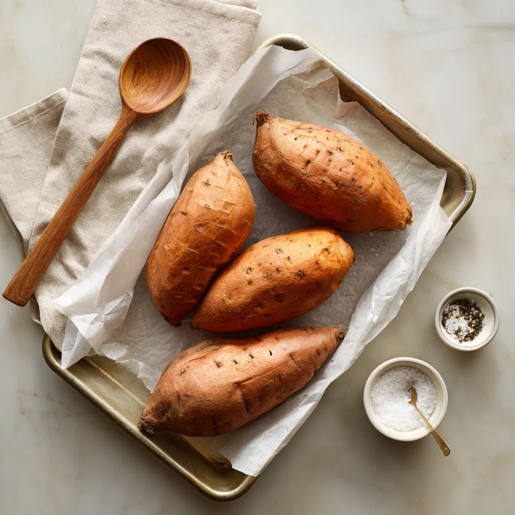 Preheat your oven to 400°F (200°C). Start by giving the sweet potatoes a good scrub, then pierce each one a few times with a fork. This helps the steam escape while they bake. Place them directly on a baking sheet and roast for 45 to 50 minutes. You’ll know they’re done when they’re soft and easy to pierce with a knife.