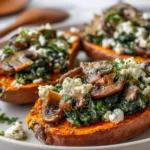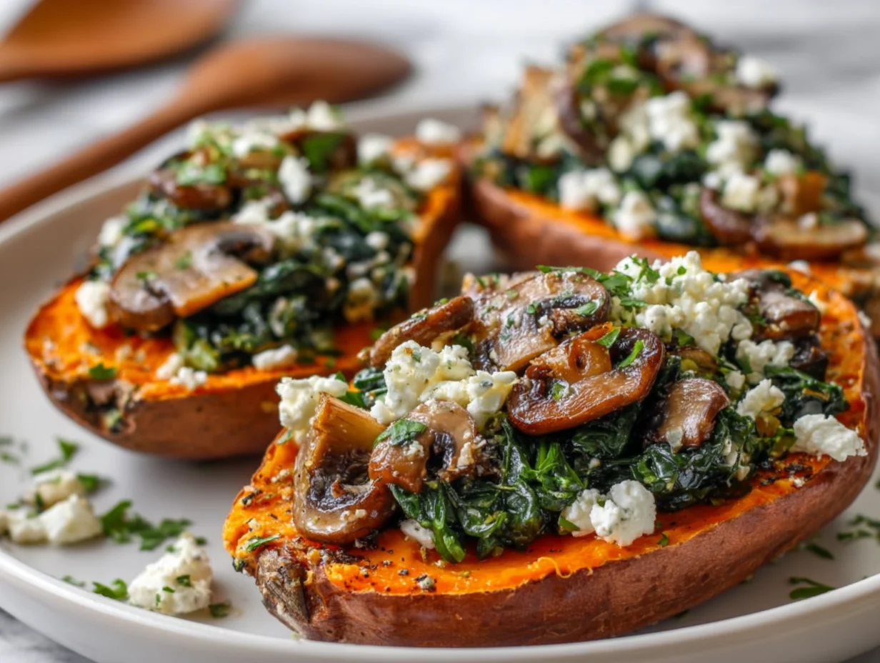 Sweet potatoes are already a superstar when it comes to flavor and nutrition, but pairing them with this savory filling really highlights how versatile they can be. The mushrooms give you that hearty, almost meaty texture, the spinach adds color and freshness, and the feta and rosemary offer a bold, aromatic twist.