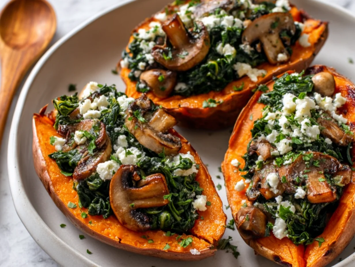 These stuffed sweet potatoes bring together savory and sweet in the most satisfying way. Roasted sweet potatoes serve as the base for a warm filling of sautéed mushrooms and spinach, accented with crumbled feta cheese and the earthy aroma of fresh rosemary. It’s a flavorful, nourishing dish that works well as a main or a hearty side.