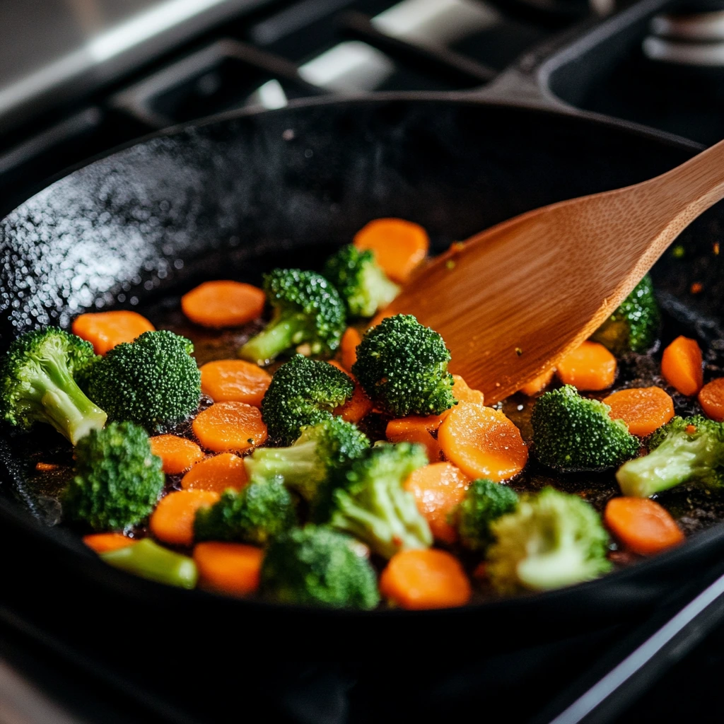 🥦 Add the broccoli and carrots, stirring frequently, and cook for about 2 minutes until they start to soften.